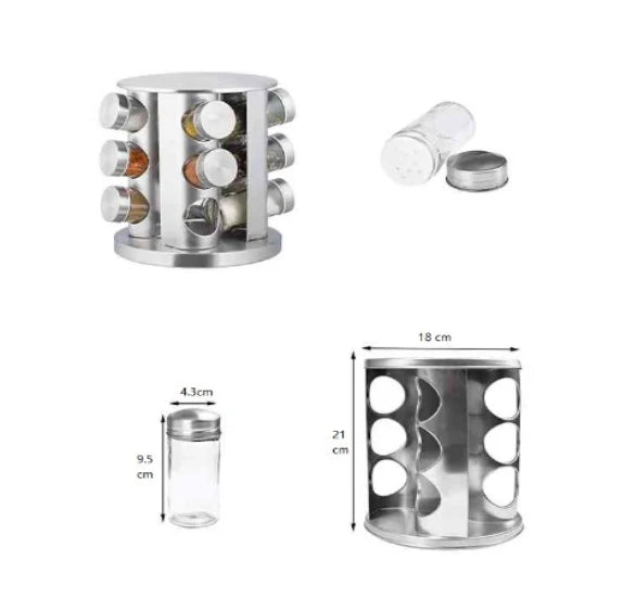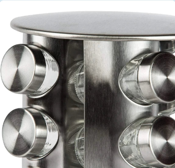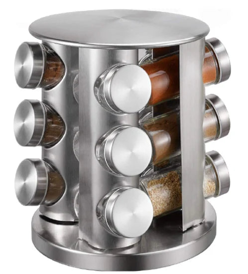 Practico Organizador Condimentero Giratorio 360°, fabricado en acero inoxidable, contiene 12 frascos de vidrio con tapa rosca.