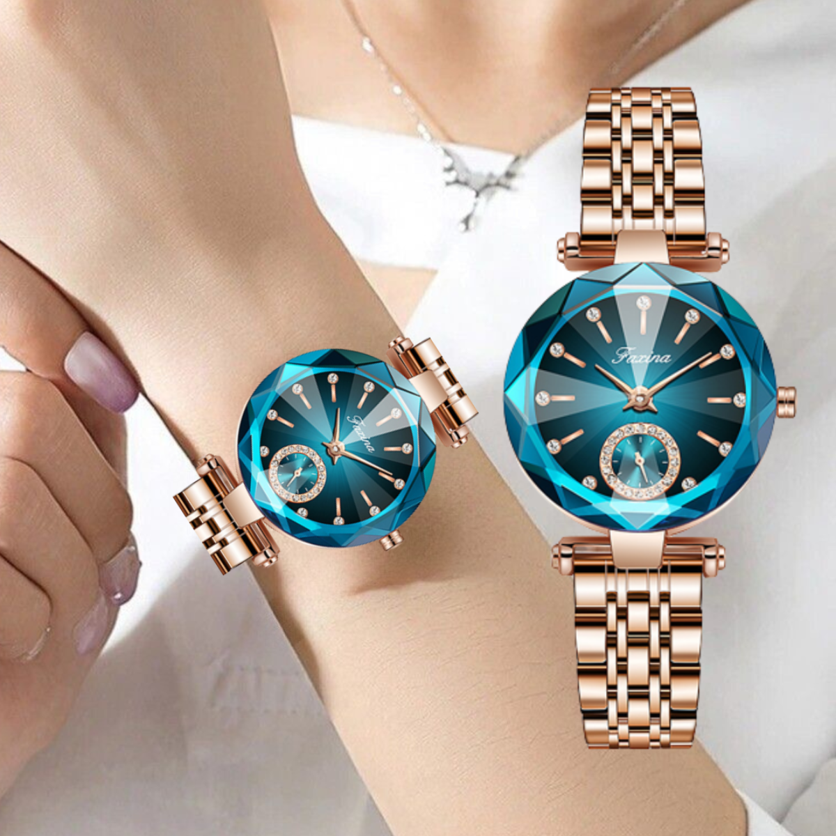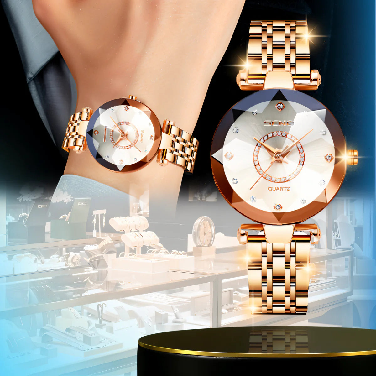Este reloj no es solo para decir la hora. El cristal facetado refleja la luz de manera única, haciéndote brillar en cada movimiento. Ideal para mujeres que buscan elegancia y distinción.